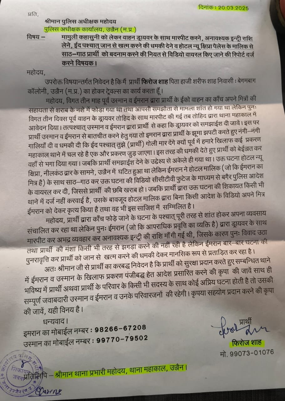 मामूली कहासुनी को लेकर वाहन ड्रायवर के साथ मारपीट करने अनावश्यक इंट्री राशी लेने ईद पश्चात जान से खत्म करने की धमकी देने व होटल अन्य आरोप पत्र सूचना मीली सूत्र ये सूचना फिरोज शाह जी द्वारा उज्जैन पुलीस मुख्यालय पर दी गई