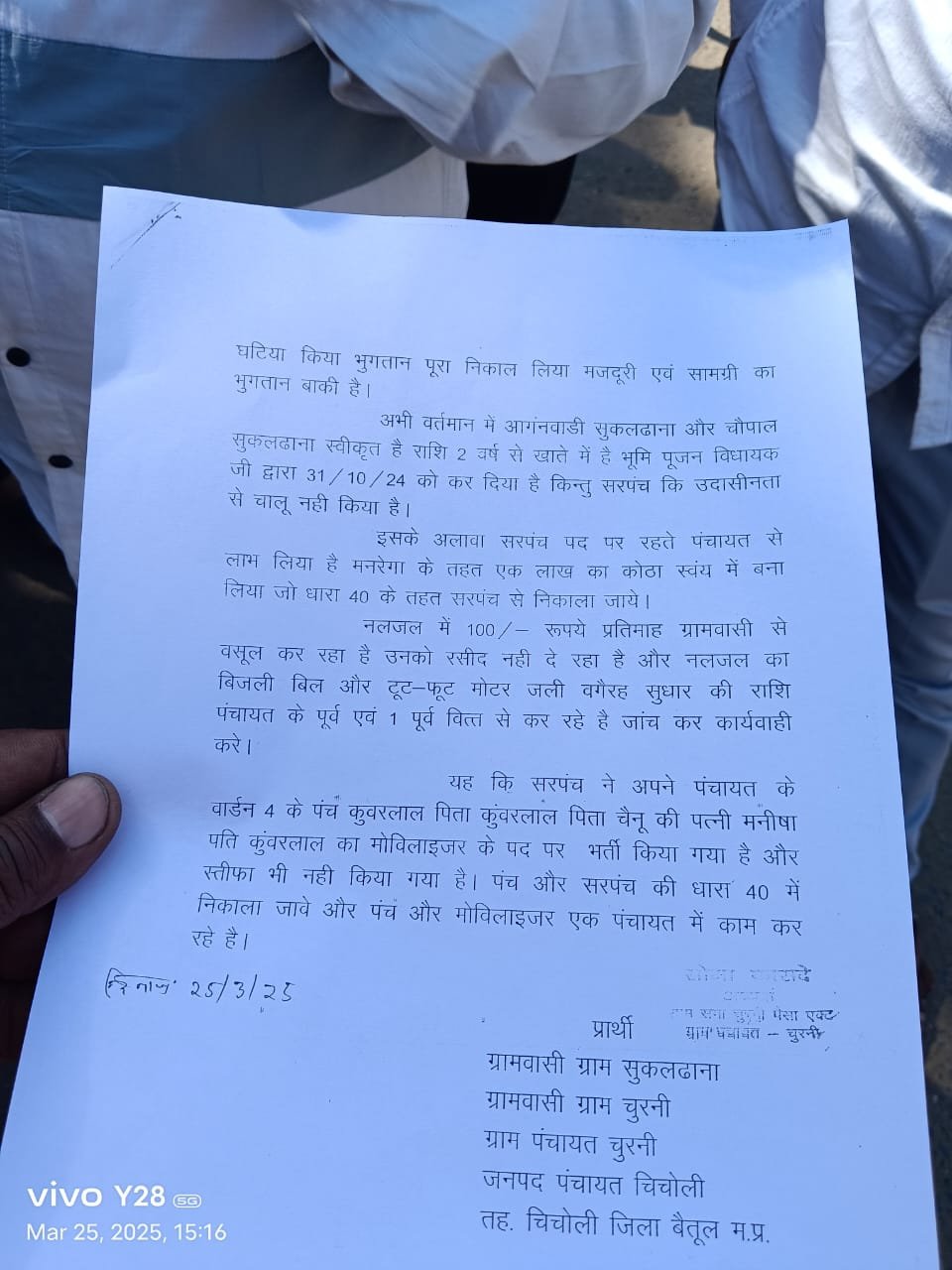 मामला बैतूल जिले की चिचोली जनपद के अंतर्गत आने वाली ग्राम पंचायत चुरानी का है। चूरनी के कुछ ग्रामीणों द्वारा सूचना के अधिकार के अंतर्गत जानकारी निकालने पर पता चला कि कागजों में एक पुलिया निर्माण हो चुका है जिसकी लागत लगभग 6.5 लख रुपए है। इसके अलावा एक पेज जल कुआ भी कागजों में ही बना है धरातल पर कुछ भी नहीं है।