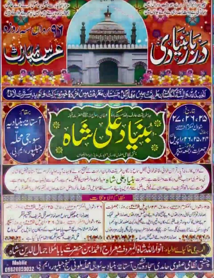 शूक्रवार 25 अप्रैल को दोपहर 3 बजे से कुल शरीफ़ की न्याज़ व रंग की मेहफ़िल होगी. उर्स के अंतिम दिन शनिवार 26 अप्रैल को पुराना पुल गोहलपुर में रात 11 बजे से सूफियाना कव्वाली का अहतिमाम किया गया है. सज्जादा नशीन सूफ़ी अल्हाज हज़रत बाबा मेराज अहमद जमाली व सूफी हज़रत खादिम बाबा जमाली ने अकीदतमंद हज़रात से उर्स में शिरकत की गुज़ारिश की है. बताते चलें कि हज़रत बाबा बुनियाद अली शाह की दरगाह शरीफ जबलपुर की कौमी एकता के लिए अलग पहचान रखती है. जहाँ हर जाति धर्म के लोग अकीदत के साथ हाजिरी देते हैं.