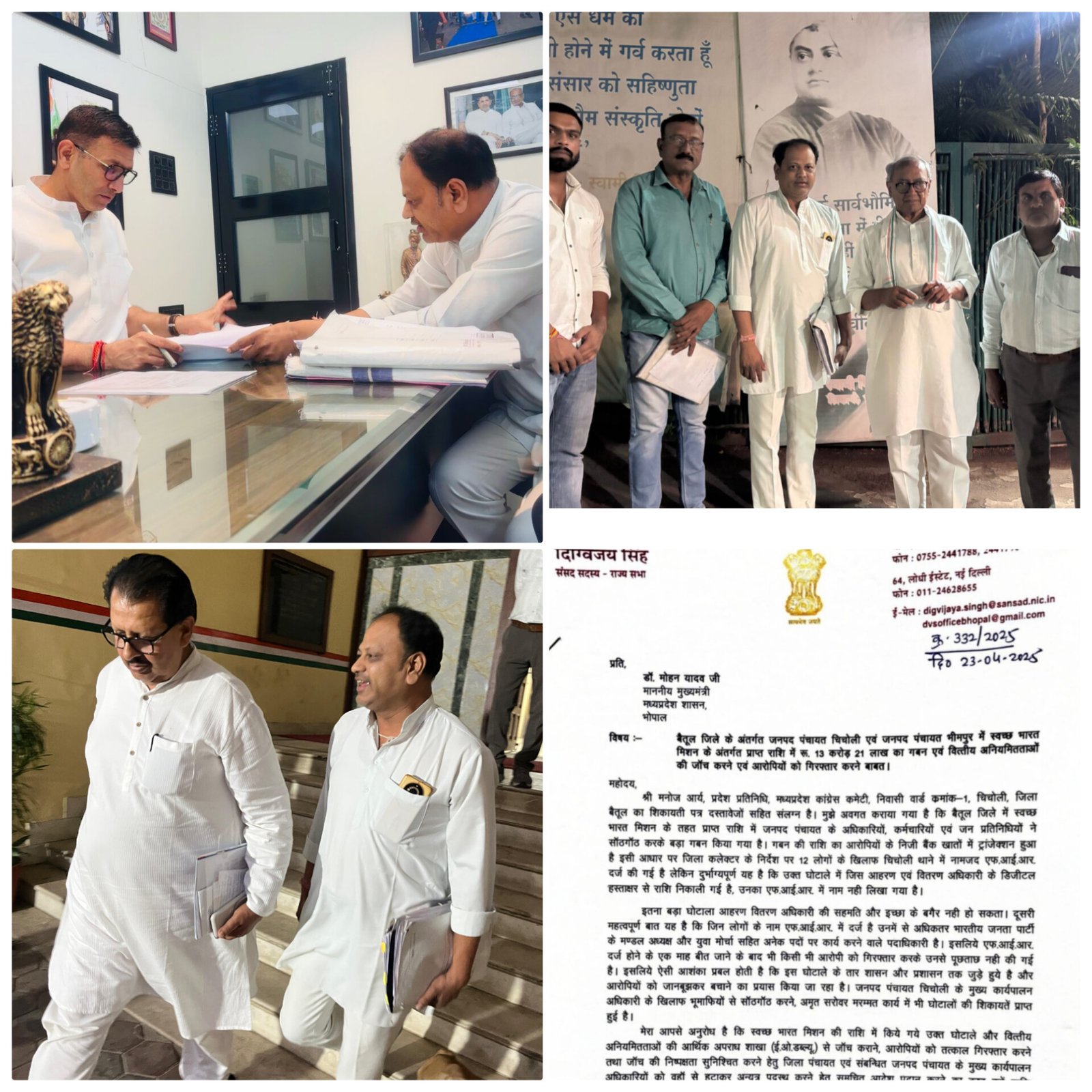 बहुचर्चित जनपद पंचायत चिचोली और जनपद पंचायत भीमपुर में 13 करोड़ 21 लाख के स्वच्छ भारत मिशन मैं हुए घोटाले को लेकर और जनपद की भूमि और मनरेगा में हुए घोटाले को लेकर मध्य प्रदेश कांग्रेस के प्रदेश प्रतिनिधि मनोज आर्या के नेतृत्व में कांग्रेस का डेलिगेशन भोपाल में जाकर मध्य प्रदेश के पूर्व मुख्यमंत्री दिग्विजय सिंह मध्य प्रदेश कांग्रेस कमेटी के अध्यक्ष जीतू पटवारी और मध्य प्रदेश के प्रभारी हरीश चौधरी से मुलाकात की और जनपद पंचायत चिचोली और जनपद पंचायत भीमपुर में वह घोटाले का बायोडाटा पेश किया। तत्काल पूर्व मुख्यमंत्री दिग्विजय सिंह ने मध्य प्रदेश के मुख्यमंत्री मोहन यादव और पंचायत मंत्री प्रहलाद पटेल को पत्र लिखकर कहा स्पष्ट जांच करें और दोषियों को अति शीघ्र गिरफ्तार कर वसूली की जाए।