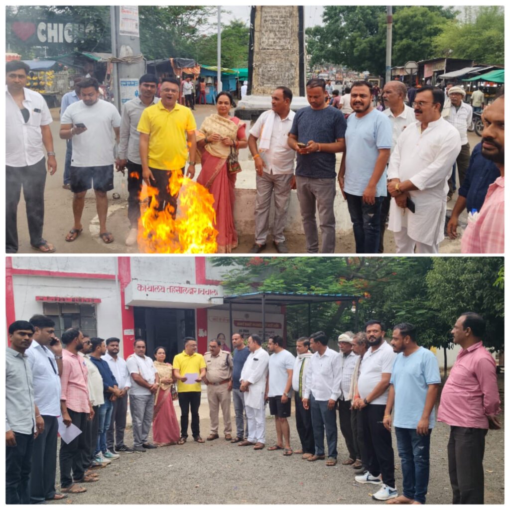 आज चिचोली में ब्लॉक कांग्रेस कमेटी शहरी एवं ग्रामीण द्वारा मंत्री विजय शाह का पुतला दहन कर उनके इस्तीफे की मांग की गई एवं मंत्री विजय शाह के खिलाफ देशद्रोह का मुकदमा दर्ज करने हेतु आवेदन दियाI कर्नल सोफिया कुरैशी का अपमान देश की सेना का अपमान हैI पूरा देश इस बयान से आहत है ।