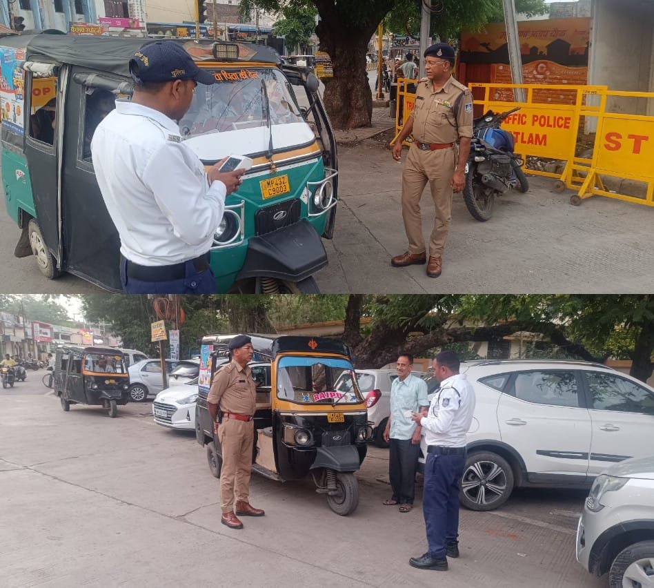 दिनांक 27.05.2025 को श्रीमान पुलिस अधीक्षक महोदय श्री अमित कुमार (भा.पु.से.), श्रीमान अतिरिक्त पुलिस अधीक्षक महोदय श्री राकेश खाखा (रा.पु.से.) उप पुलिस अधीक्षक यातायात श्री आन्नद स्वरुप सोनी के निर्देशन में थाना प्रभारी का.निरी.नीलम चौंगड, सूबेदार अनोखीलाल परमार, का सउनि. सर्वेश द्विवेदी, प्रआर.222 धीरेन्द्र दीक्षित, आर. 1152 भगत सिह, आर.1045 शिवकुमार, आर.759 नरेन्द्र चौरे के महु रोड बस स्टेण्ड व दिलबहार चौराहा ब्रीज के पास व रेल्वे स्टेशन व सैलाना बस स्टेण्ड पर आँटो की चैकिंग की गई एवं चैकिंग के दौरान बीना युनिक नम्बर आँटो व बीमा, फीटनेश, लाईसेंस, आदि कागज चैक किये गये जिन आँटो के कागज कम्पलिट नही थे उन पर चालानी कार्यवाही की गई । चैकिंग के दौरान 04 आँटो चालको के फीटनेस के व 02 आँटो के बीमा के मो.वि. एक्ट के तहत चालानी कार्वयाही कर कुल-06 चालान बनाये जाकर कुल- 18000/- रुपये समन शुल्क वसुला गया। यातायात पुलिस रतलाम द्वारा सभी वाहन चालको को हीदायत दी गई कि अपने वाहन निर्धारित आँटो स्टेण्ड पर खडे करे व वाहन में क्षमता से अधिक सवारी अपने वाहन में नही बैठाकर सडक दुर्घटनाओं में कमी लाने हेतु यातायात पुलिस रतलाम का सहयोग करे। शहर में नियम विरुद्ध वाहनो के विरुध्द निरंतर कार्यवाही जारी रहेगी।