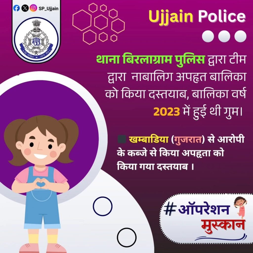इसी तारतम्य में अति.पुलिस अधीक्षक मयूर खण्डेलवाल एवं नगर पुलिस अधीक्षक नागदा बृजेश श्रीवास्तव के मार्गदर्शन में थाना प्रभारी थाना बिरलाग्राम उनि जितेन्द्र पाटीदार और उनकी टीम द्वारा वर्ष 2023 में ग्राम टकरावदा बिरलाग्राम से अपहृत नाबालिग को खम्बाडिया (गुजरात) से आरोपी पप्पू पिता भुवान उम्र 23 साल निवासी ग्राम टकरावदा बिरलाग्राम जिला उज्जैन (म.प्र.) के कब्जे से दस्तयाब किया गया।