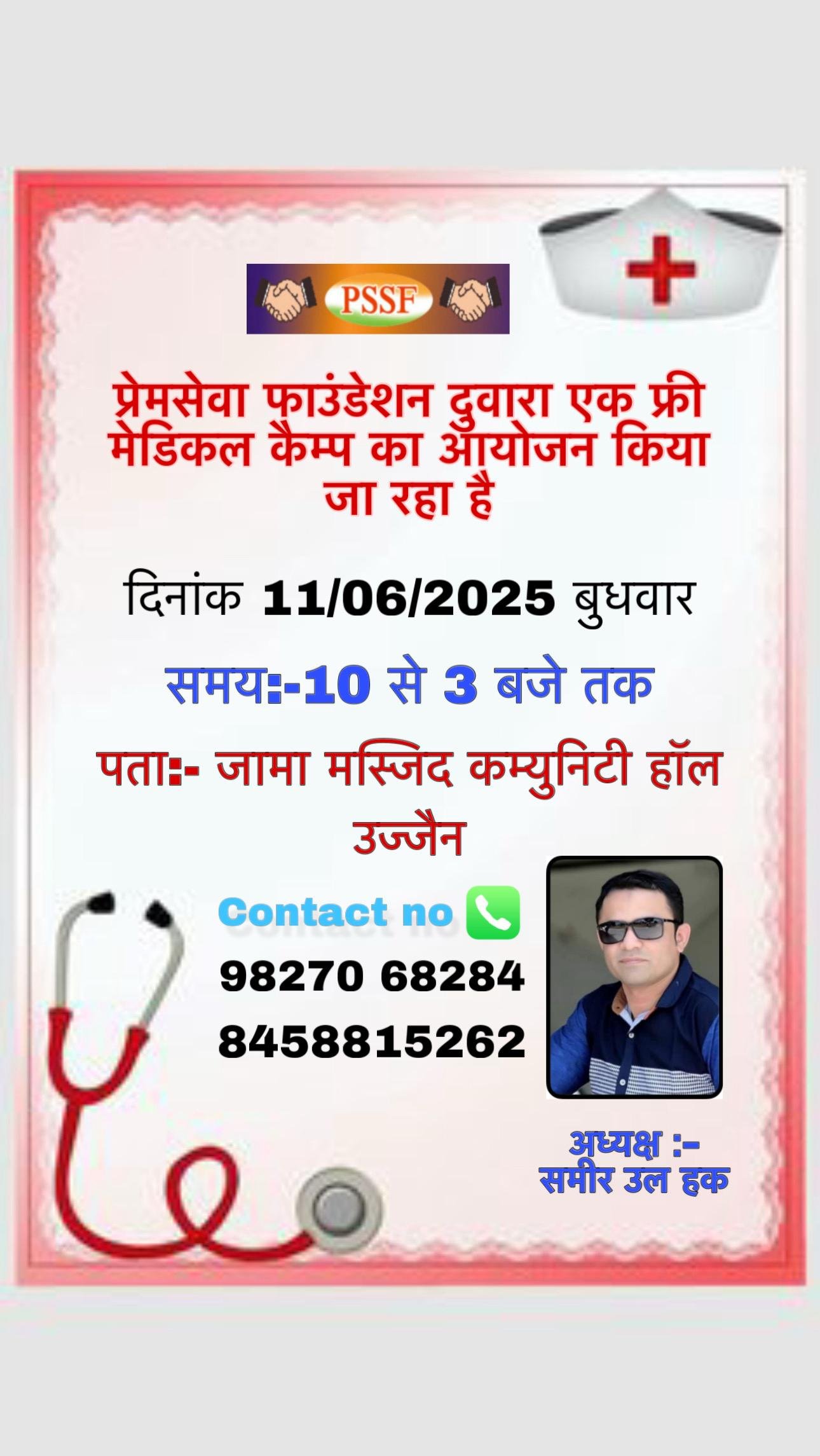 उज्जैन में प्रेम फाउन्डेशन द्वारा एक नि:शुल्क स्वास्थ्य जांच मेडिकल शिविर का आयोजन बुधवार, 11/06/2025 को किया जाएगा। स्थान जामा मस्जिद कम्युनिटी हाल होगा। 🏥💊👨⚕️