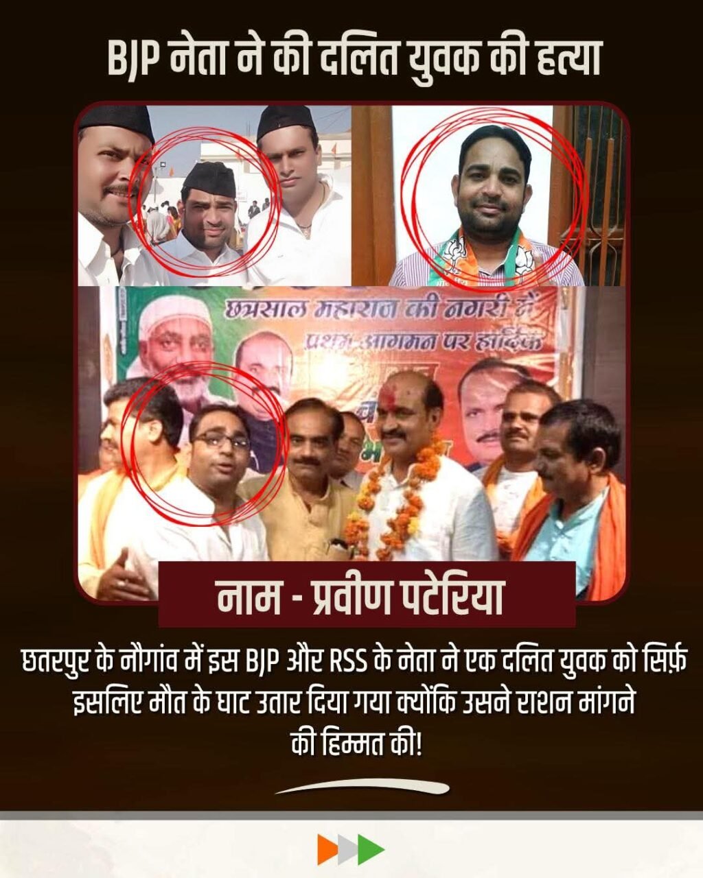 नौगांव में एक दलित युवक को सिर्फ़ इस लिए मौत के घाट उतार दिया गया क्योंकि उसने राशन मांगने की हिम्मत की। और चौंकाने वाली बात ये इस जघन्य #हत्या का आरोप भाजपा और #RSS नेता प्रवीण पटेरिया पर है!