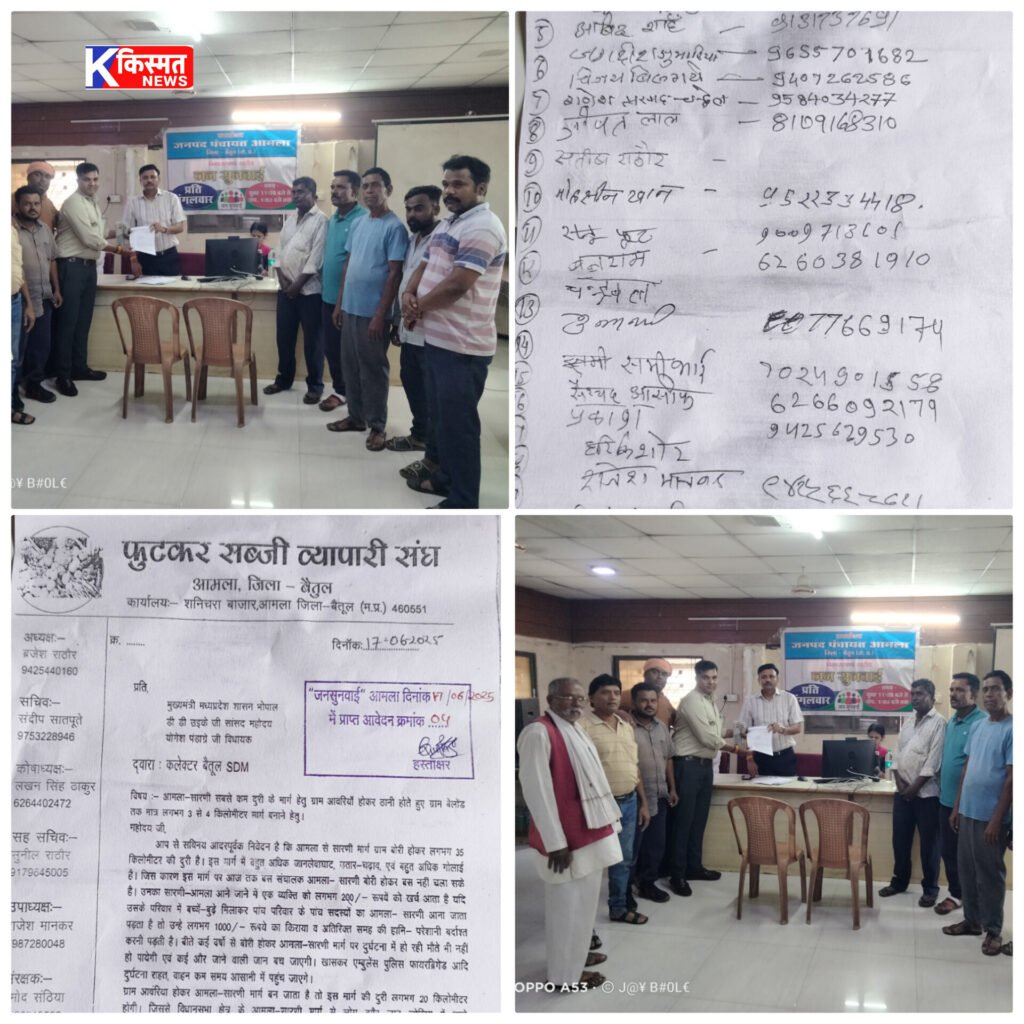 “आज दिनांक 17/ 6 /2025 आमला सारणी मार्ग के लिए जनसुनवाई में एसडीएम के द्वारा मुख्यमंत्री मध्य प्रदेश शासन भोपाल, सांसद डी डी ऊईके जी ,विधायक योगेश पंडाग्रे जी के नाम फूटकर सब्जी व्यापारी संघ आमला द्वारा ज्ञापन सोपा गया