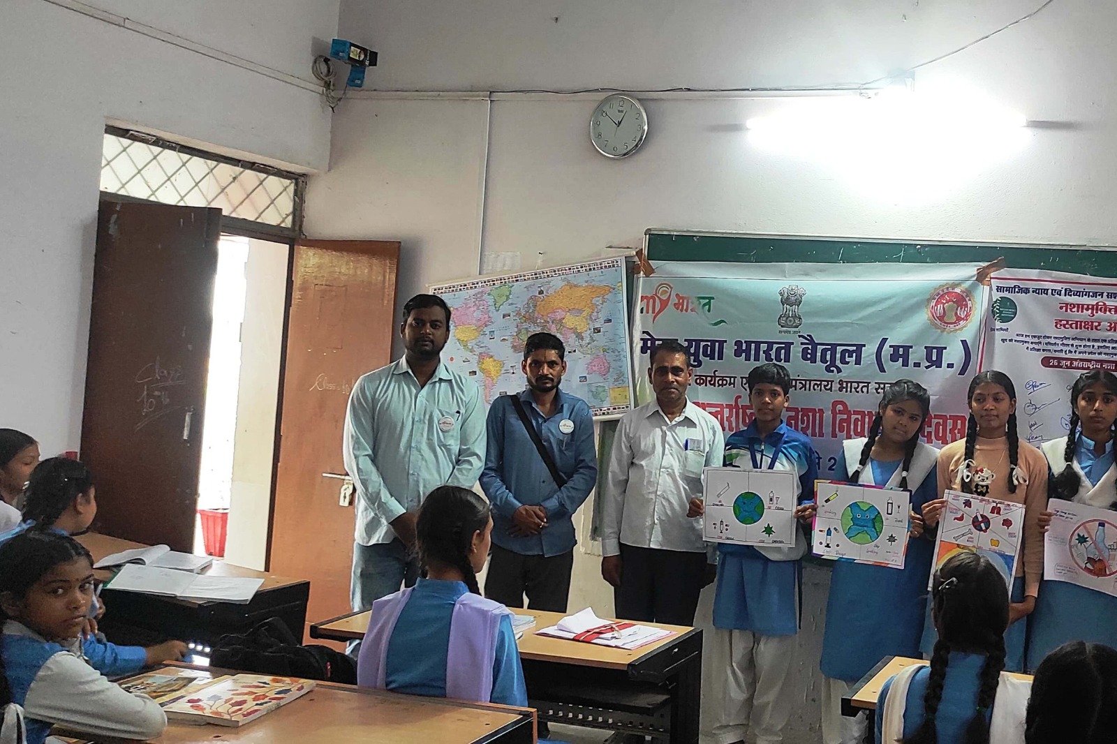 मेरा युवा भारत बैतूल मप्र युवा कार्यक्रम खेल मंत्रालय भारत सरकार व उपसंचालक सामाजिक न्याय एवं दिव्यांगजन सशक्तिकरण विभाग बैतूल द्वारा शासकीय कन्या शाला गंज में नशा मुक्ति अभियान के अंतर्गत चलाया गया। यह अभियान विगत 1 जून से 26 जून तक संयुक्त विभाग व समाजसेवियों द्वारा संपूर्ण जिले में नशे की लत को कम करने के उद्देश्य से अभियान चलाया जा रहा है। जिसके अंतर्गत आज सामूहिक तौर पर शपथ कलापथक विभाग द्वारा लोकगीत गाकर संदेश दिया गया। इसी के साथ चित्रकला प्रतियोगिता निबंध प्रतियोगिता, नारे लेखन प्रतियोगिता का भी आयोजन किया गया। इस मौके पर प्राचार्य ललित लिल्हारे ने बच्चों से आह्वान किया कि शपथ लो कि हम नशे को अपने जीवन में प्रवेश नहीं करने देंगे। डॉ.महेश गुंजेले ने नशा से बचने हेतु बच्चों को समझाइए देते हुए बताया कि नशा कभी खत्म नहीं होता है खत्म होने वाला केवल व्यक्ति ही है। धनंजय सिंह ठाकुर ने मेरा युवा भारत की जानकारी से अवगत कराया और नशा से दूर रहने के लिए युवा पीढ़ी से आग्रह किया। इस अवसर पर आशीष कोकने, कलापथक विभाग के नवल किशोर महोबे ,संजय कलमे, शिव प्रसाद मोहरे ,कृष्ण गोपाल बारमासे ,अशोक कवडे, करण पवार, दीपक मस्कोले आदि मौजूद थे।