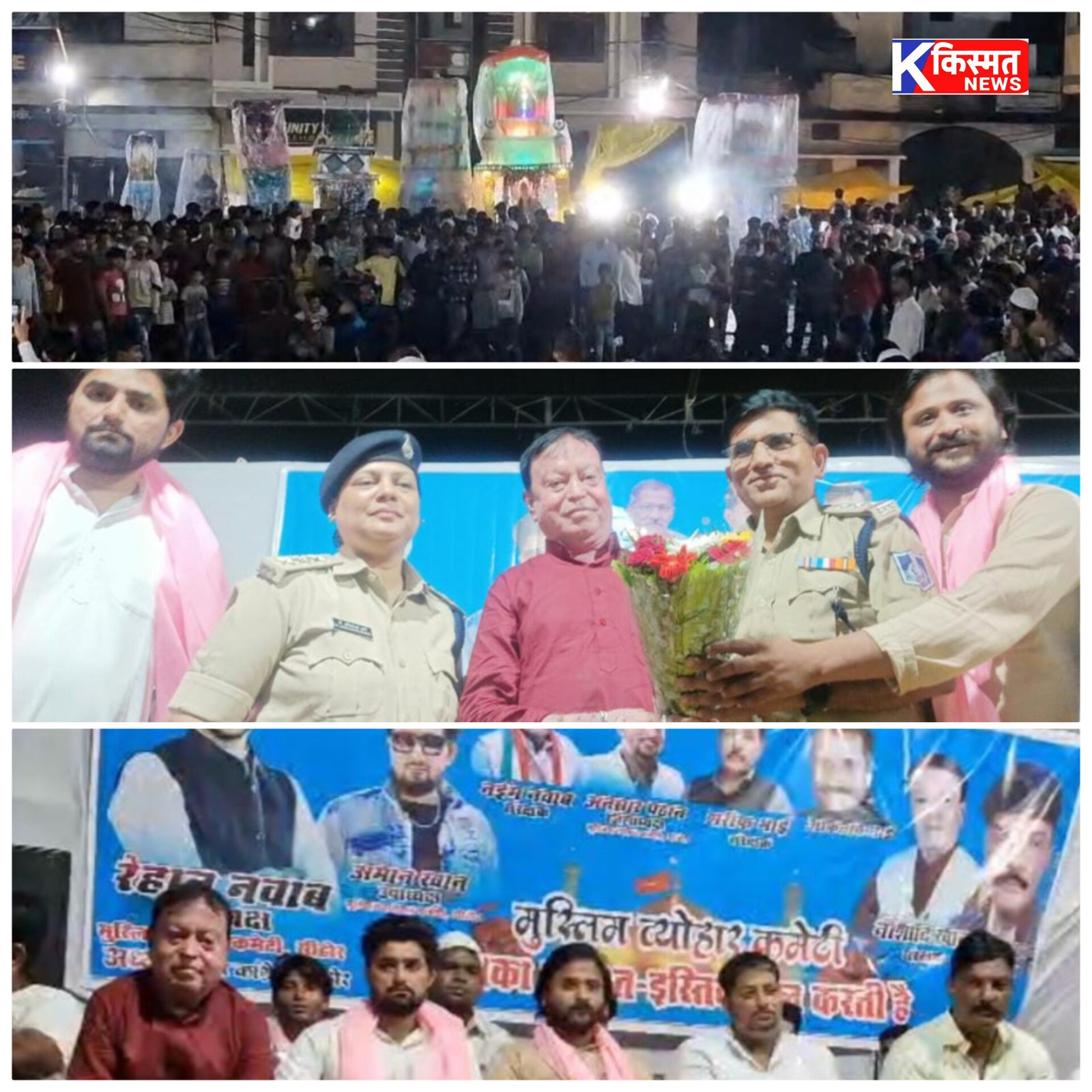 भोपाली फाटक पर मंच पर बनाकर मोहर्रम मुस्लिम त्यौहार कमेटी और सर्वधर्म दुल्हा बादशाह दरगाह कमेटी के सदर रिजवान पठान, कमेटी सचिव नौशाद खान और अध्यक्ष रेहान नबाव उपाध्यक्ष अमान खान द्वारा सीएसपी अभिनंदा शर्मा और कोतवाली प्रभारी राविंद्र यादव और ताजिए सवारी निकालने वाले और अखाड़ों के खलिफाओं कलाकारों का शील्ड स्मृति चिन्हा भेंटकर साफा बांधकर सम्मान किया गया। कमेटी के सचिव नौशाद खान ने सहयोग देने पर पुलिस प्रशासन, नगर पालिका विघुत मंडल का आभार व्यक्त किया। कार्यक्रम का सफल संचालन रिजवान पठान के द्वारा किया गया। कार्यक्रम में नईम नबाव, शरीफ कबाड़ी, हनीफ कुरैशी, बकोली,हामिद हाजी,मुुंशीलाल, सुनील धाड़ी,, छोटा पहलवान,, आफताव अली, साहिल,अनवर बाबा, बिलाल अहमद, अंसार अहमद, कसम झंकार, रफीक मियां,पप्पू मिया भंवर लाल मेवाड़ा,तारीख मियां,सावरावी महमूद सहित सैकड़ो लोग शामिल हुए।