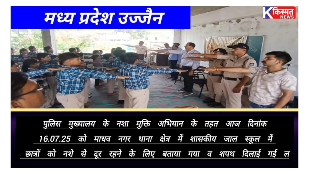 उज्जैन.पुलिस मुख्यालय के नशा मुक्ति अभियान के तहत आज दिनांक 16.07.25 को माधव नगर थाना क्षेत्र में शासकीय जाल स्कूल में छात्रों को नशे से दूर रहने के लिए बताया गया व शपथ दिलाई गई l – किस्मत न्यूज