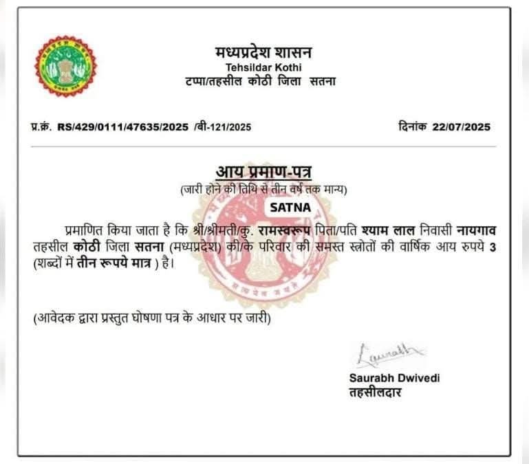 सतना जिले में सामने आए एक मामले ने सभी को चौंका दिया। यहां एक व्यक्ति की वार्षिक आय महज 3 रुपये दर्ज की गई थी, यानी औसतन मासिक आय सिर्फ 25 पैसे! यह जानकारी एक आय प्रमाण पत्र में दर्ज की गई थी, जिसे देखकर न केवल स्थानीय प्रशासन हैरान हुआ, बल्कि सोशल मीडिया पर भी इस दस्तावेज की तस्वीरें तेजी से वायरल होने लगीं।