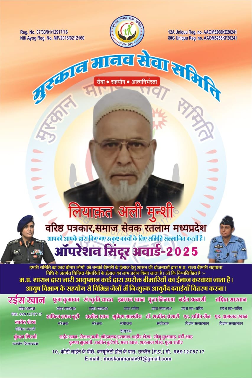 आज उज्जैन की ख्याति प्राप्त मुस्कान मानव सेवा समिति जो देशभर मे अपने मानव सेवा मिशन के बैनरतले लोगो की मददगार बनकर आज ऊंचाईयों के एक अज़ीम मुकाम पर है।