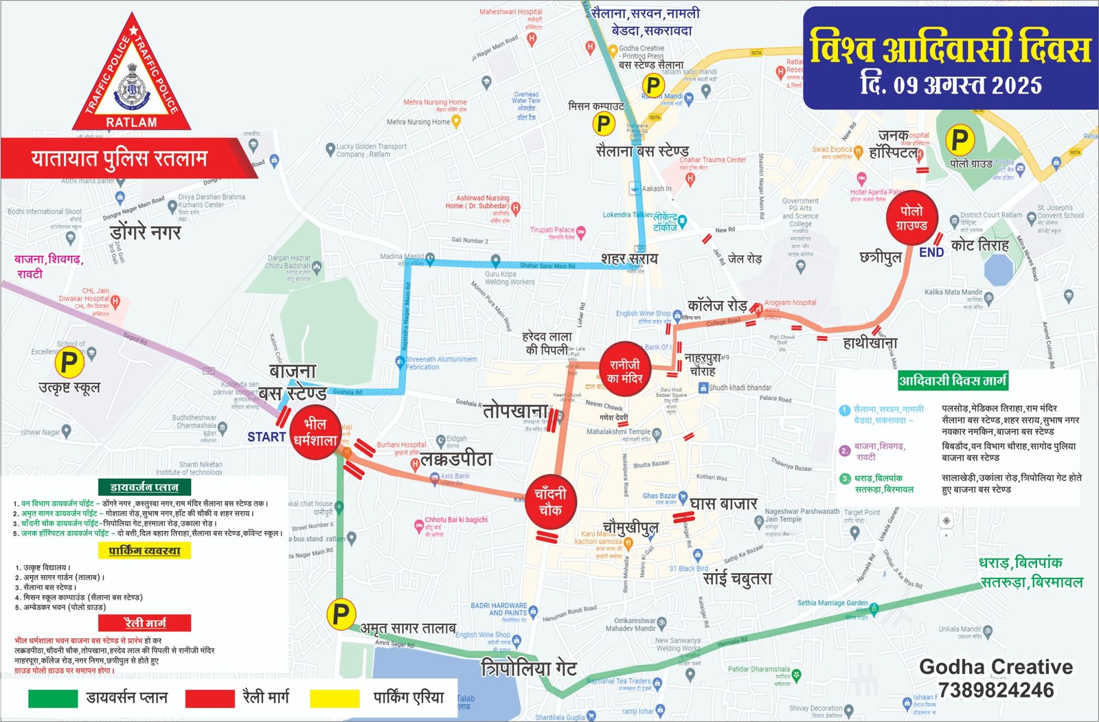 रतलामी दिनांक 09/08/2025 को विश्व आदिवासी दिवस जिले मे मनाया जायेगा । जिसके तहत रतलाम शहर का मुख्य आयोजन पोलो ग्राउण्ड रतलाम में प्रातः 11.00 बजे से 16.00 बजे तक किया जाना प्रस्तावित है। उक्त कार्यक्रम में आदिवासी संगठन एवं काफी संख्या में सैलाना, सरवन, बाजना, रावटी, शिवगढ, बिलपांक क्षेत्र से ग्रामीण जन रैली के रुप में पोलो ग्राउण्ड रतलाम पहुचेंगे। कार्यक्रम में काफी संख्या मे लोगो के आने की सम्भावना पर रतलाम शहर की आम जनता की सुविधा को देखते हुए रतलाम यातायात पुलिस द्वारा निम्नानुसार यातायात व्यवस्था एवं डायवर्जन प्लॉन तैयार किया गया है:-