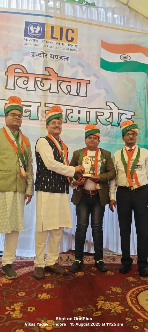 वित्तीय सलाहकार विकास यादव सम्मानित* *79 वे स्वतंत्रता दिवस के उपलक्ष में भारतीय जीवन बीमा निगम इंदौर मंडल द्वारा माननीय एसडीएम महोदय प्रभात जी साहू के कर कमलों से देवास शाखा क्रमांक 1 के वित्तीय सलाहकार विकास पिता सुरेशचंद्र यादव (LIC MDRT) सोनकच्छ का शिल्ड देकर सम्मान किया गया