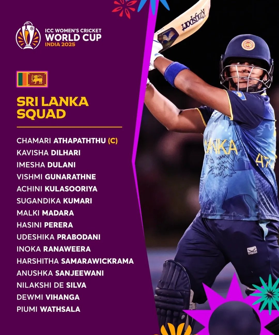 श्रीलंका क्रिकेट ने आईसीसी महिला क्रिकेट विश्व कप 2025 के लिए 15 सदस्यीय टीम की घोषणा की है, जिसका नेतृत्व अनुभवी चमारी अथापथु करेंगी। यह टूर्नामेंट 30 सितंबर से 2 नवंबर 2025 तक भारत और श्रीलंका में आयोजित किया जाएगा।
