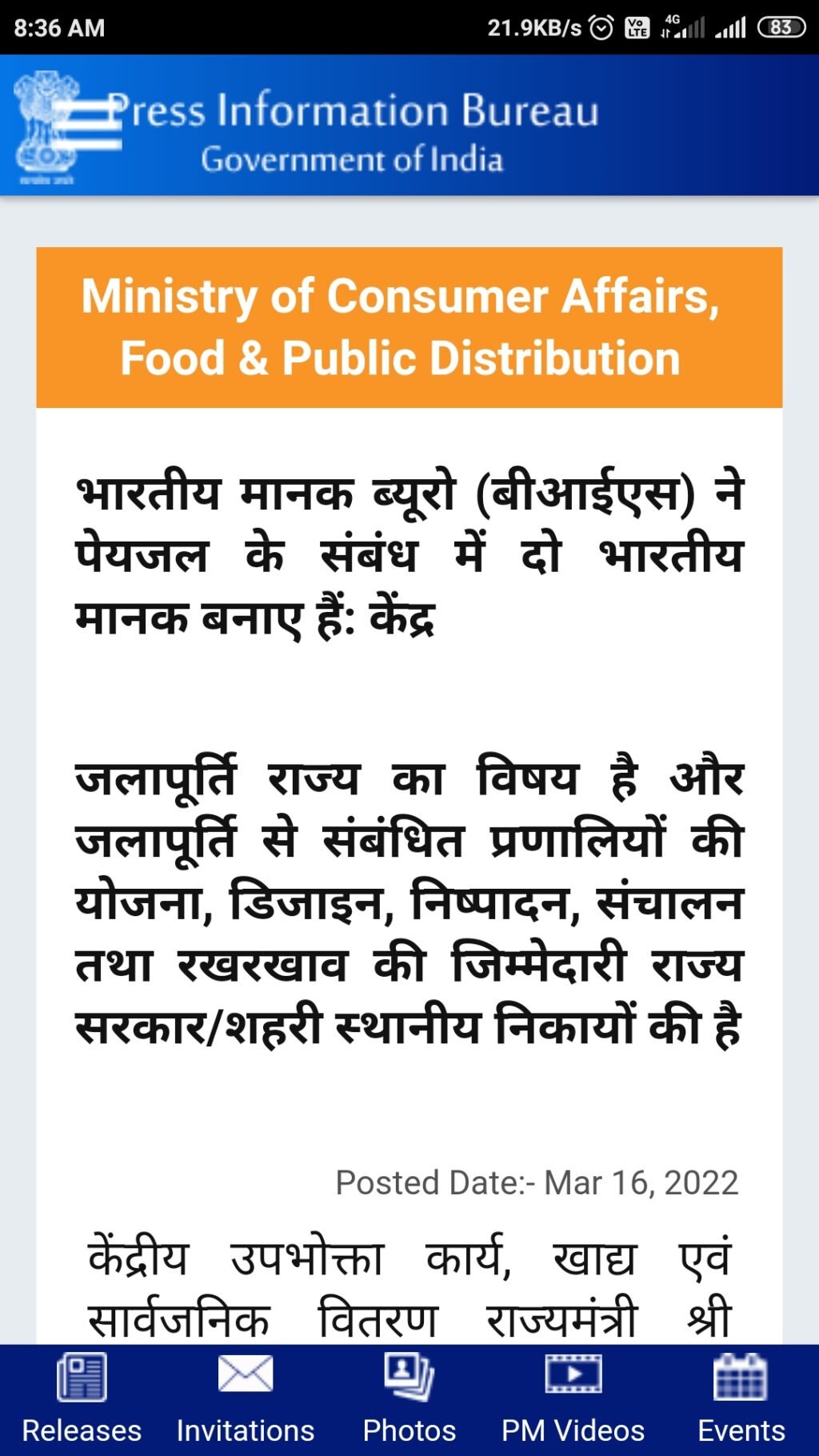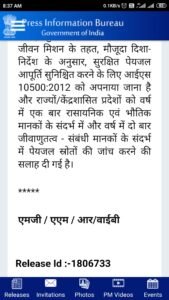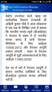 भारतीय मानक ब्यूरो (बीआईएस) ने पेयजल के संबंध में दो भारतीय मानक बनाए हैं: केंद्रजलापूर्ति राज्य का विषय है और जलापूर्ति से संबंधित प्रणालियों की योजना, डिजाइन, .gov.in/PressRelease – किस्मत न्यूज