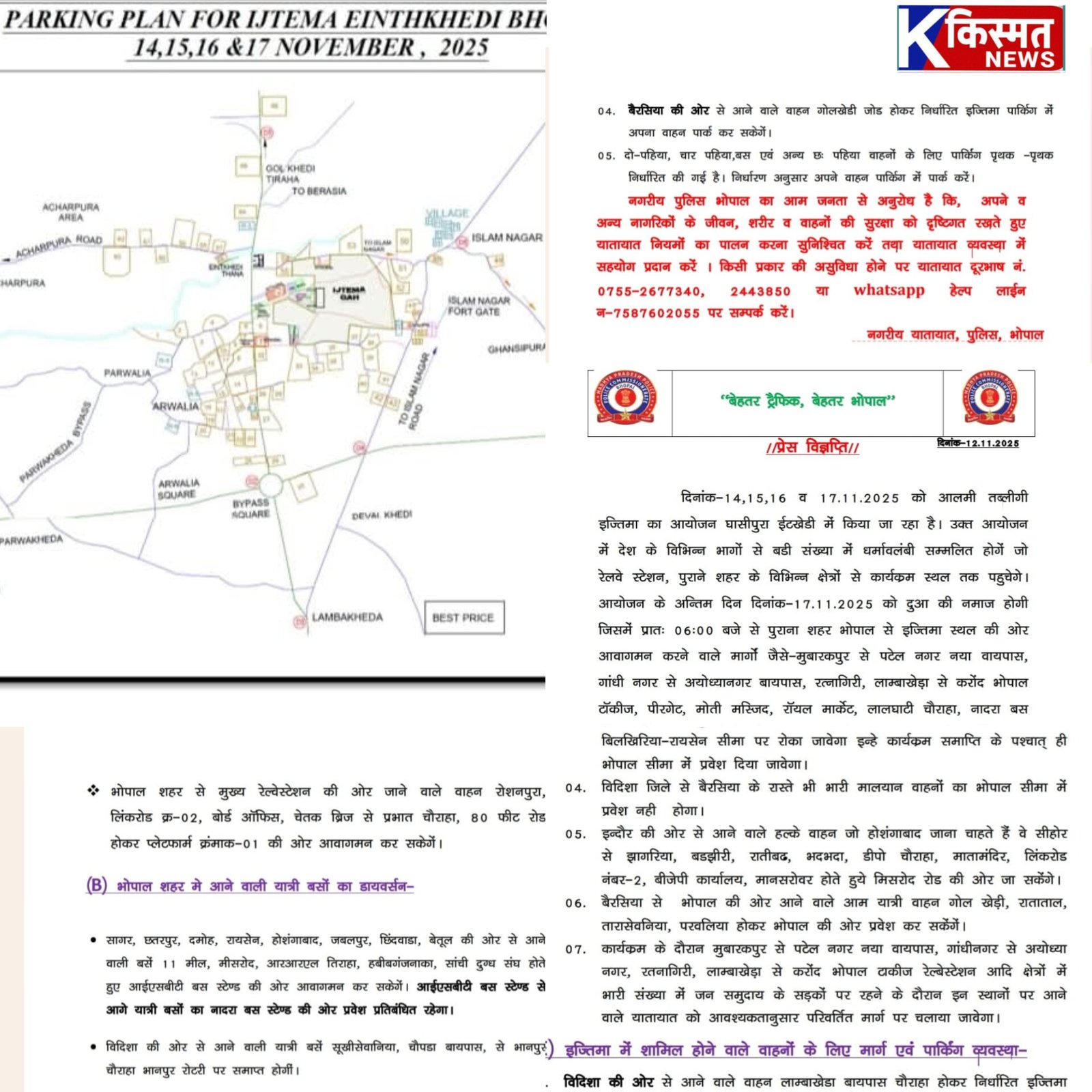 Kismat news:- भोपाल इज्तिमा में अगर आप भी जा रहे हैं तो ट्रैफिक व्यवस्था समझ लीजिए कार से कहां पर ट्रैफिक करना कहां पर रास्ता चालू रहेगा और कहां पर बंद रहेगा जरूरी जानकारी