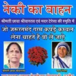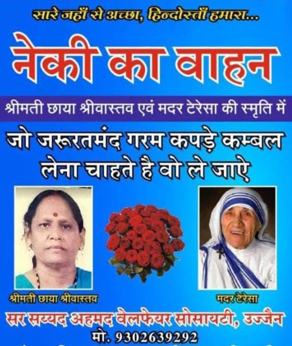 एवं समाजसेवी अजीज भाई दरगाह वाला की स्मृति में 13 दिसंबर एवं दीन दुखियों की मसीहा मदर टेरेसा एवं शिक्षाविद छाया श्रीवास्तव की स्मृति में 20 दिसंबर कोजरूरतमंदों के लिए नेकी का वाहन चलाया जाएगा l सर सैयद अहमद वेलफेयर सोसाइटी के अध्यक्ष पंकज जयसवाल एवं संरक्षक सैयद अबीद अली ने विस्तृत जानकारी देते बताया संस्था द्वारा गत वर्षो की तरह इस वर्ष भी शीत ऋतु से बचने के लिए नेकी का वाहन दो शख्सियतो की स्मृति में प्रत्येक शनिवार रात्रि 10:00 बजे शहर के विभिन्न चौराहो से चलाया जाएगाl उपसंयोजक नासिर मंसूरी एवं संयुक्त सचिव सोनू सिंह आनंद ने बताया इस सप्ताह आजाद हिंद फौज के संस्थापक, महान क्रांतिकारी नेताजी सुभाष चंद्र बोस एवं समाजसेवी अजीज भाई दरगाह वाला की स्मृति में जरूरतमंदों के लिए के लिए नेकी का वाहन छत्री चौक से चलाया जाएगा l जिसमें कंबल और गर्म कपड़े ,स्वेटर ,जरकिन जरूरतमंदों को वितरित की जाएगी l सहसंयोजक मुश्ताक खान एवं उपाध्यक्ष सैयद उस्मान हसन ने बताया 20 दिसंबर शनिवार को दीन दुखियों की मसीहा मदर टेरेसा एवं शिक्षाविद छाया श्रीवास्तव की स्मृति में नेकी का वाहन फ्रीगंज टावर से चलाया जाएगा l समाजसेवी मोहम्मद इकबाल उस्मानी ने सभी सामाजिक संगठनों एवं संपन्न नागरिकों से अपील की वह भी शीत ऋतु से बचने के लिए जरूरतमंदों की मदद के लिए आगे आए हैं और अपने स्तर पर जरूरतमंदों को कंबल, रजाई ,जरकिन और ग्रीष्म वस्त्र उपलब्ध कराएं l जानकारी नासिर हुसैन भइयूभाई एवं डॉ शकील अंसारी ने दी l