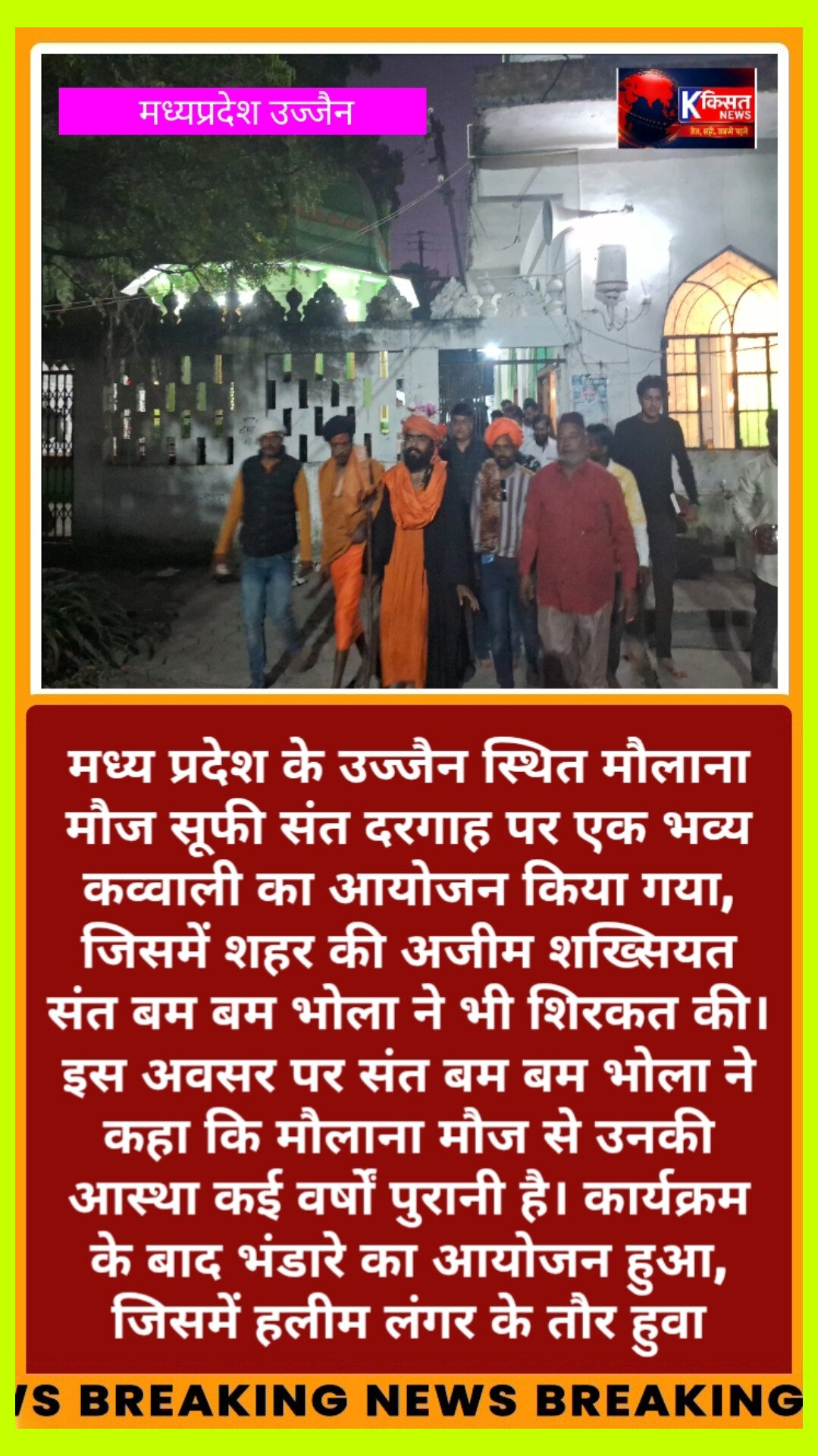 किस्मत न्यूज़ उज्जैन.मध्य प्रदेश के उज्जैन स्थित मौलाना मौज सूफी संत दरगाह पर एक भव्य कव्वाली का आयोजन किया गया, जिसमें शहर की अजीम शख्सियत संत बम बम भोला ने भी शिरकत की। इस अवसर पर संत बम बम भोला ने कहा कि मौलाना मौज से उनकी आस्था कई वर्षों पुरानी है। कार्यक्रम के बाद भंडारे का आयोजन हुआ, जिसमें हलीम लंगर के तौर पर तक्सीम किया गया
