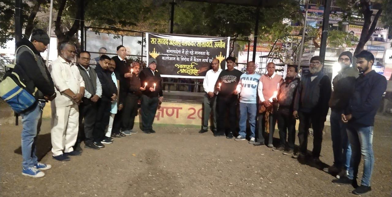 किस्मत न्यूज़ उज्जैन.बांग्लादेश में हो रहे मानवता के कत्लेआम के विरोध में सर सैयद अहमद वेलफेयर सोसाइटी द्वारा आज शहीद पार्क से कैंडल मार्च निकाला गया
