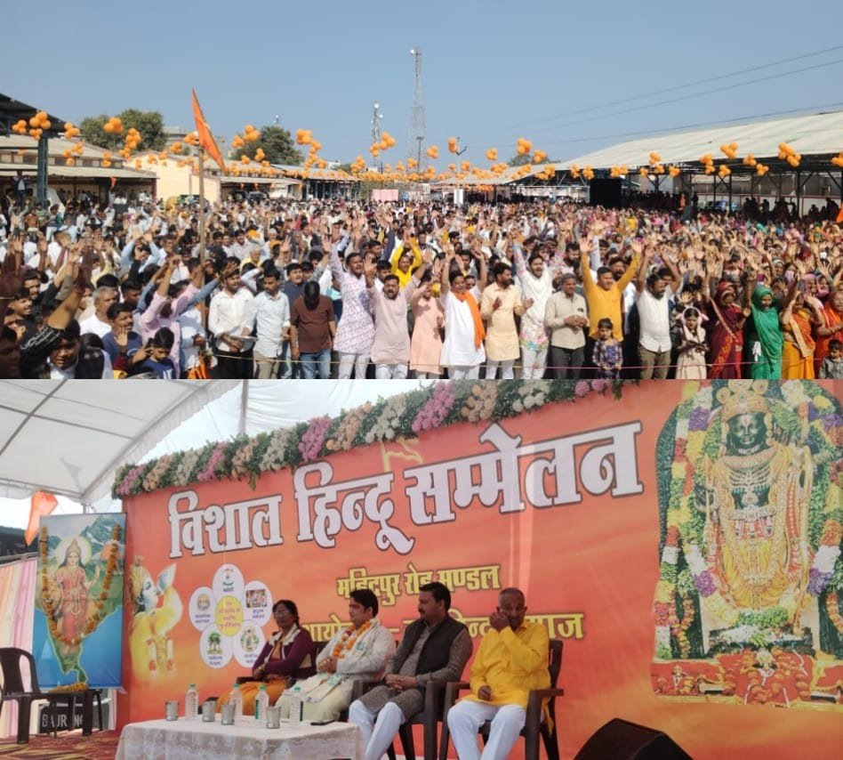 महिदपुर रोड विशाल हिंदू सम्मेलन का आयोजन हिंदू संगठन द्वारा कृषि उपज मंडी परिसर में आयोजित किया गया रविवार को श्री शिव मंदिर से कृषि उपज मंडी तक एक विशाल शोभायात्रा निकाली गई जिसमें हजारों हिंदुओं ने सम्मिलित होकर एकता देश भक्ति एवं हिंदुत्व का का परिचय दिया शोभायात्रा में सभी भागवा ध्वज लहराते हुए भगवान श्री राम के मंगलकारी जय कारे लगाते हुए चल रहे थे। शोभायात्रा नगर के मुख्य मार्गो से होकर कृषि उपज मंडी परिसर पहुंची वहां पर हिंदू सम्मेलन कार्यक्रम प्रारंभ हुआ। जिसमें मुख्य अतिथि संत श्री प्रदीप जी महाराज भाई जी ने कहां की हमें हिंदुत्व की रक्षा के लिए सदैव आगे आना चाहिए प्रत्येक प्रत्येक हिंदू में हिंदुत्व का भाव होना चाहिए भारत में रहने वाला हर एक हिंदू है। विभाग कार्यवाह पारस जी गहलोत ने अपने बौद्धिक मैं कहां की हम सब एक ही माला की मोती है हिंदू समाज को सजक एवं जागृत होने की आवश्यकता है हर भारतवासी को अपने हिंदू होने पर गर्व होना। चाहिए रेखा दीदी राष्ट्रीय सेविका समिति प्रमुख मे भी संबोधित किया अतिथियों का पुष्पमाला शाल श्रीफल से स्वागत पुरुषोत्तम सोनी, जगदीश अरोड़ा, कान्हा गुर्जर,सेवाराम जाट ने किया कार्यक्रम पश्चात सामूहिक भोज का आयोजन किया गया जिसमें हजारों की संख्या में हिंदू समाज ने एक ही पंगत एक ही संगत में भोजन को ग्रहण किया। हिंदू सम्मेलन के संयोजक कमल सिंह बापू, भोजन प्रभारी दशरथ राठौर, संतोष जायसवाल, बालकृष्ण राठौर, रतन सिंह , चैन सिंह गोविंद पोरवाल अरविंद बरडिया, दीपक शर्मा ,मुकेश चौधरी अमन उपाध्याय, धर्मराज, मनीष जैन ,प्रभु लाल अहिरवार, श्याम गुलाटी, आदि अनेक समाजसेवी संगठनो, ग्रामीण जनों एवं हिंदू युवा संगठन के सदस्यों ने आयोजन को सफल बनाने में सहयोग प्रदान किया आभार हिंदू सम्मेलन आयोजन के संयोजक कमल सिंह बापू ने कार्यक्रम की सफलता पर सभी हिंदू समाज जनों एवं कार्यकर्ताओं का आभार व्यक्त किया। ‌ उक्त जानकारी जानकारी नगर के सामाजिक कार्यकर्ता सचिन भंडारी ने दी