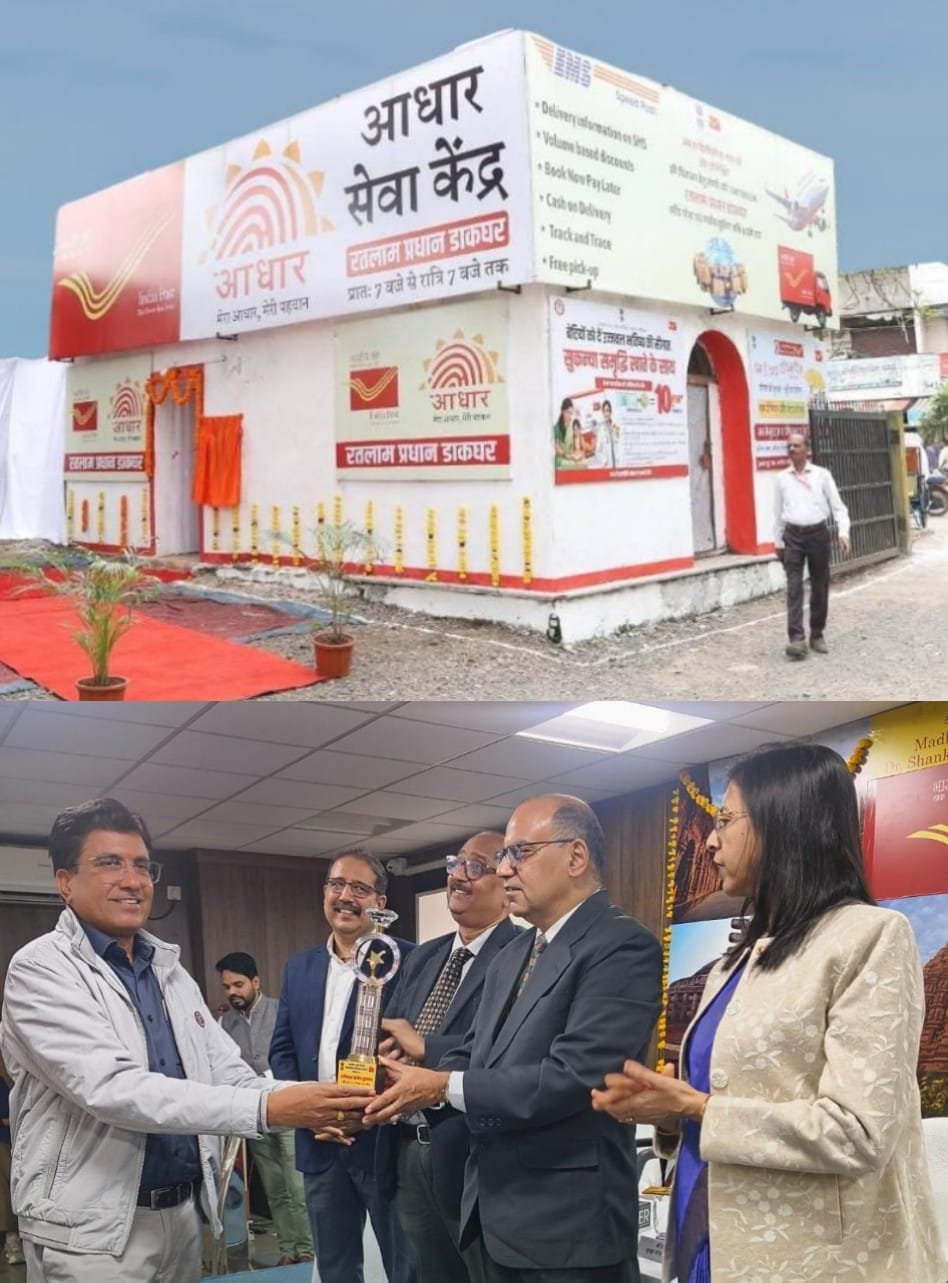 मध्यप्रदेश डाक परिमंडल में वर्ष 25-26 में 1 अप्रैल से 31 दिसंबर तक की अवधि के लिए परिमंडल के 23 संभागों और 55 जिलों में संचालित आधार सेवा केंद्रों में रतलाम प्रधान डाकघर स्थित आधार सेवा केंद्र को मध्यप्रदेश का सर्वश्रेष्ठ आधार सेवा केंद्र चुना गया है। 16 जनवरी को भोपाल में आयोजित समारोह में मुख्य पोस्टमास्टर जनरल मध्यप्रदेश परिमंडल श्री विनीत माथुर, पोस्टमास्टर जनरल जबलपुर परिक्षेत्र श्री बृजेश कुमार और पोस्टमास्टर जनरल इंदौर परिक्षेत्र श्रीमती प्रीति अग्रवाल द्वारा अधीक्षक डाकघर रतलाम राजेश कुमावत को परिमंडल ट्रॉफी से पुरस्कृत किया गया। रतलाम प्रधान डाकघर में आधार सेवा केंद्र सोमवार से शनिवार तक प्रातः 7 बजे से रात्रि 7 बजे तक अनवरत संचालित होता है।