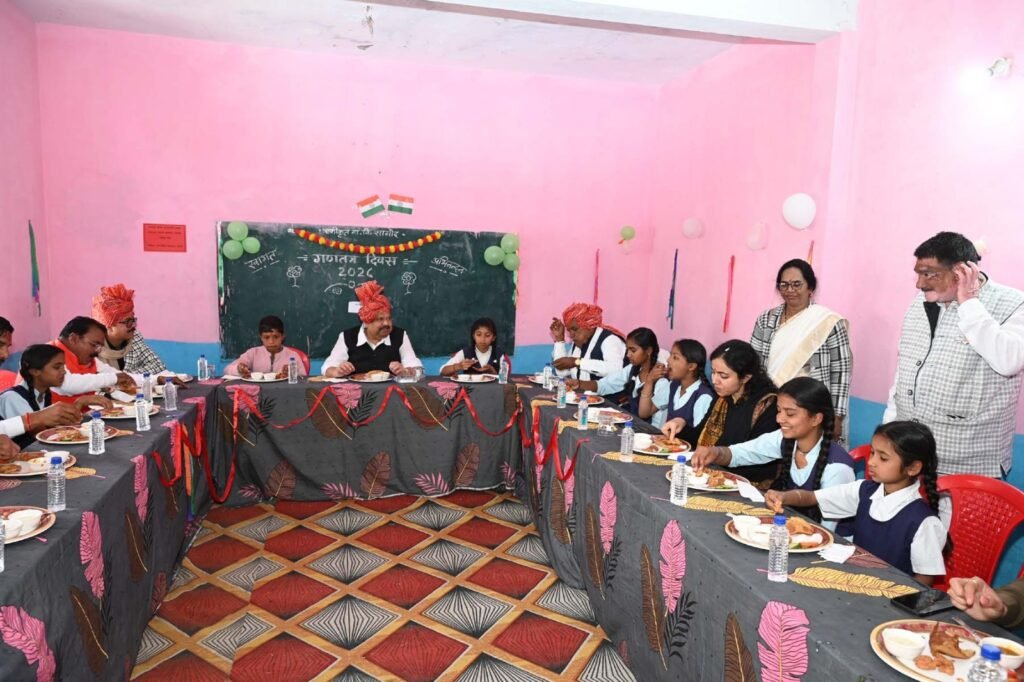 गणतंत्र दिवस पर ग्राम सागोद में मुख्य अतिथि कैबिनेट मंत्री चेतन्य काश्यप ने बच्चों के साथ किया भोजन।