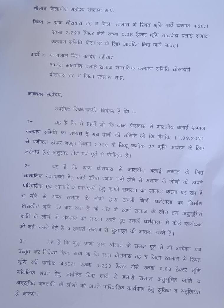 श्रीमान जिला अधिकारी महोदय, #रतलाम (म. प्र.) विषय: ग्राम धौंसवास तह. व जिला रतलाम में स्थित भूमि सर्वे क्रमांक...